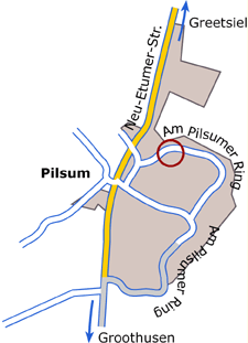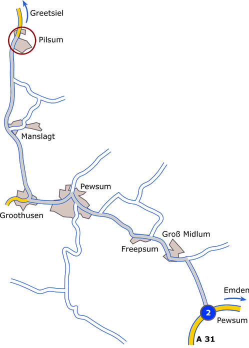 Mit dem Auto: Sie fahren auf der A28 bzw. A31 über Leer nach Emden bis zur Ausfahrt "Pewsum" (Nr.2). Fahren Sie nun über Groß-Midlum, Freepsum, Canum, Pewsum, Groothusen und Manslagt nach Pilsum. In Pilsum fahren Sie in Höhe der Kirche über die Bushaltestelle und biegen in die Straße "Am Pilsumer Ring". Gleich neben unserem Bauernhof befindet sich das Ferienhaus "Muslip".